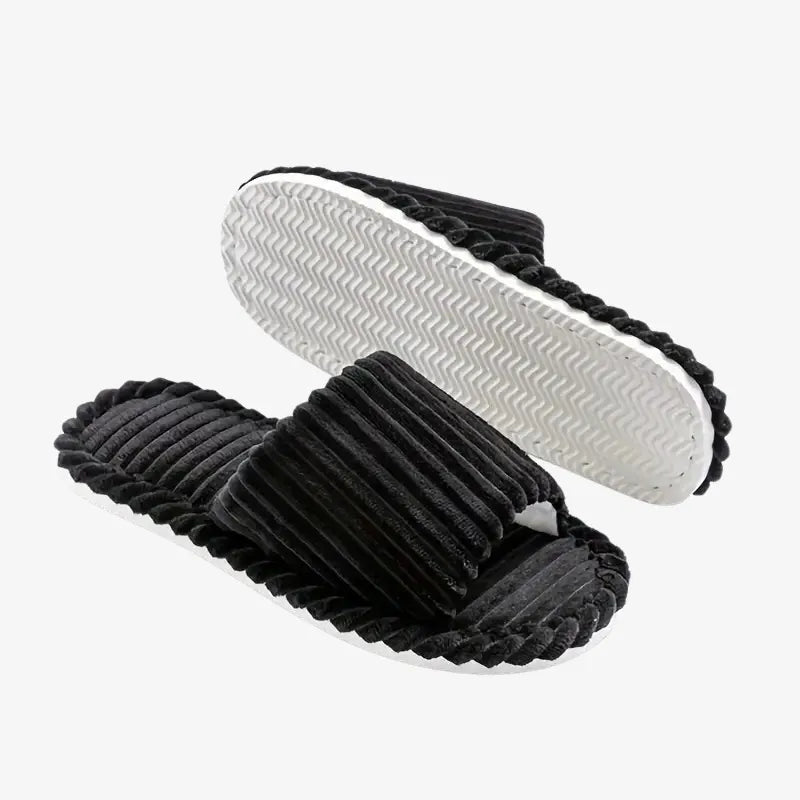 Les Mules Élégance Noire arborent un design chic et épuré qui apporte une touche d'élégance à vos moments de détente. Leur texture en velours côtelé noir offre un rendu visuel sophistiqué qui s'harmonise parfaitement avec votre intérieur.