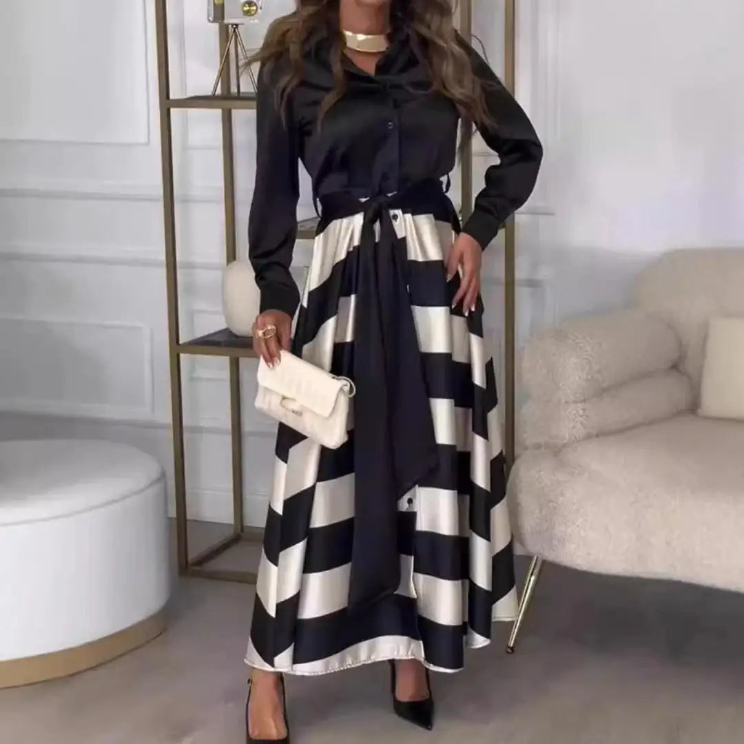 Conçue pour flatter toutes les morphologies, elle offre une coupe longue et fluide qui accompagne naturellement chacun de vos pas. Le tissu satiné glisse avec douceur, apportant à la tenue un charme aérien et une allure féminine affirmée.