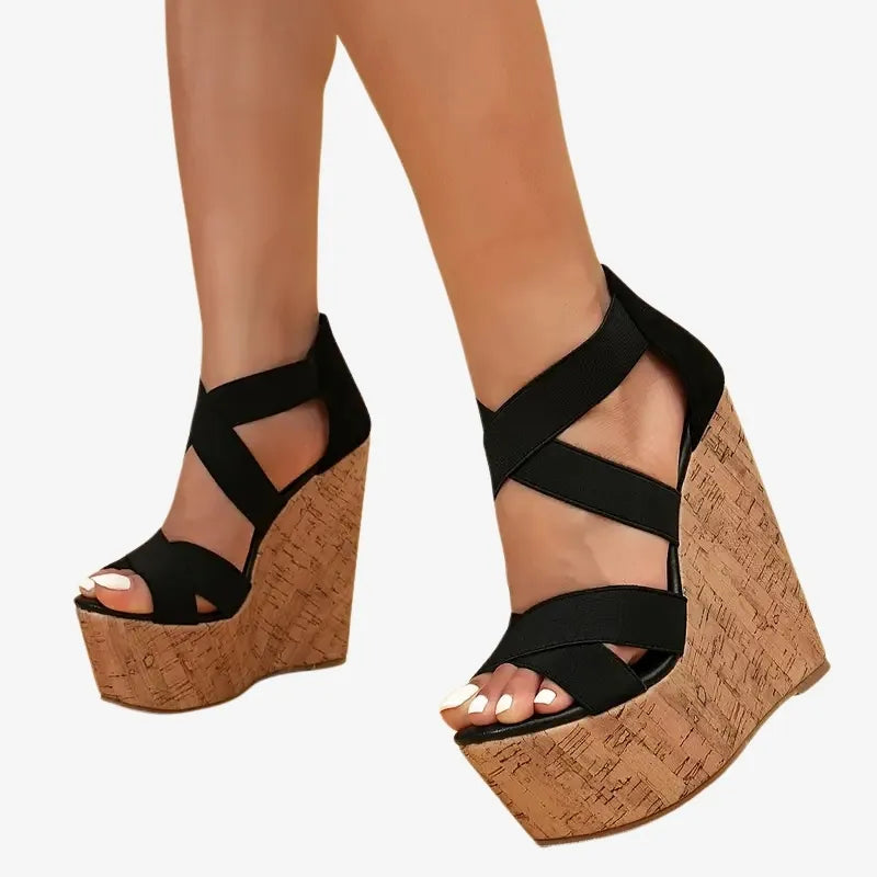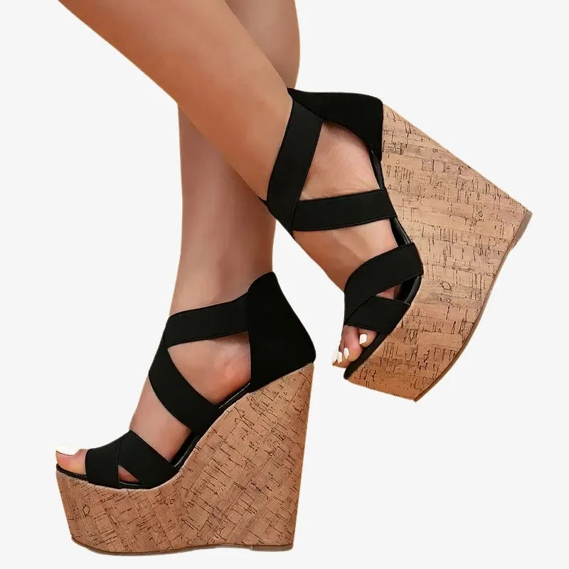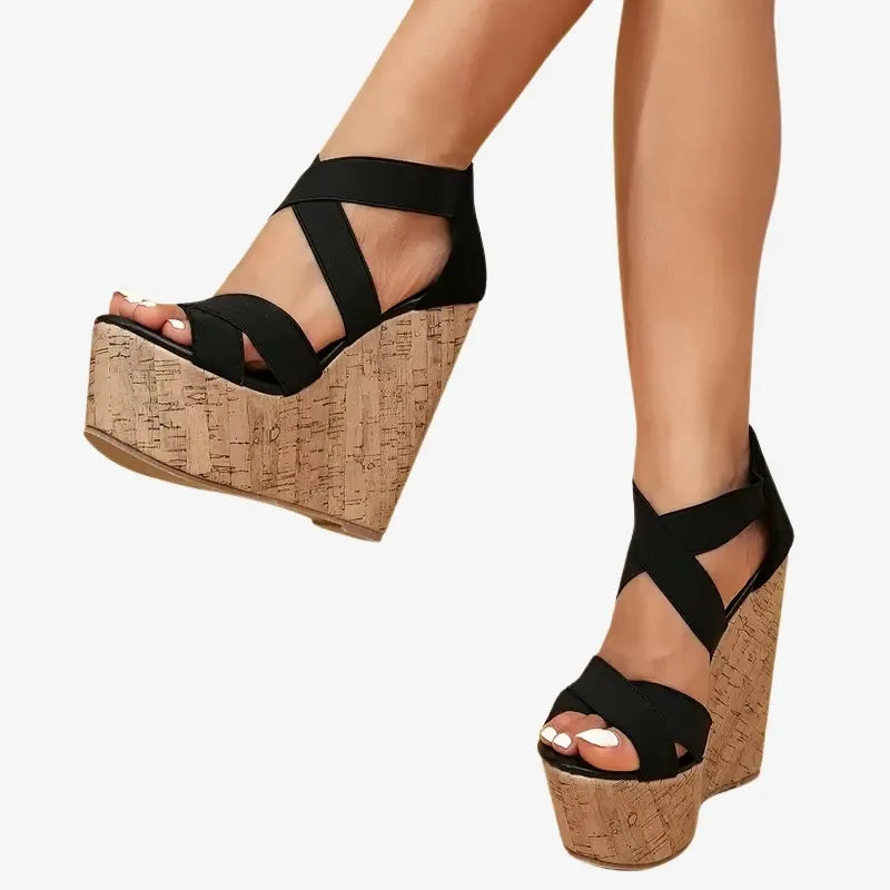 Ces sandales compensées au design moderne allient l’élégance du noir à l’aspect naturel du liège pour un rendu raffiné. Leur silhouette imposante met en valeur votre allure tout en offrant un confort optimal.