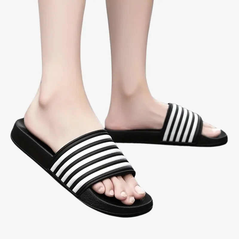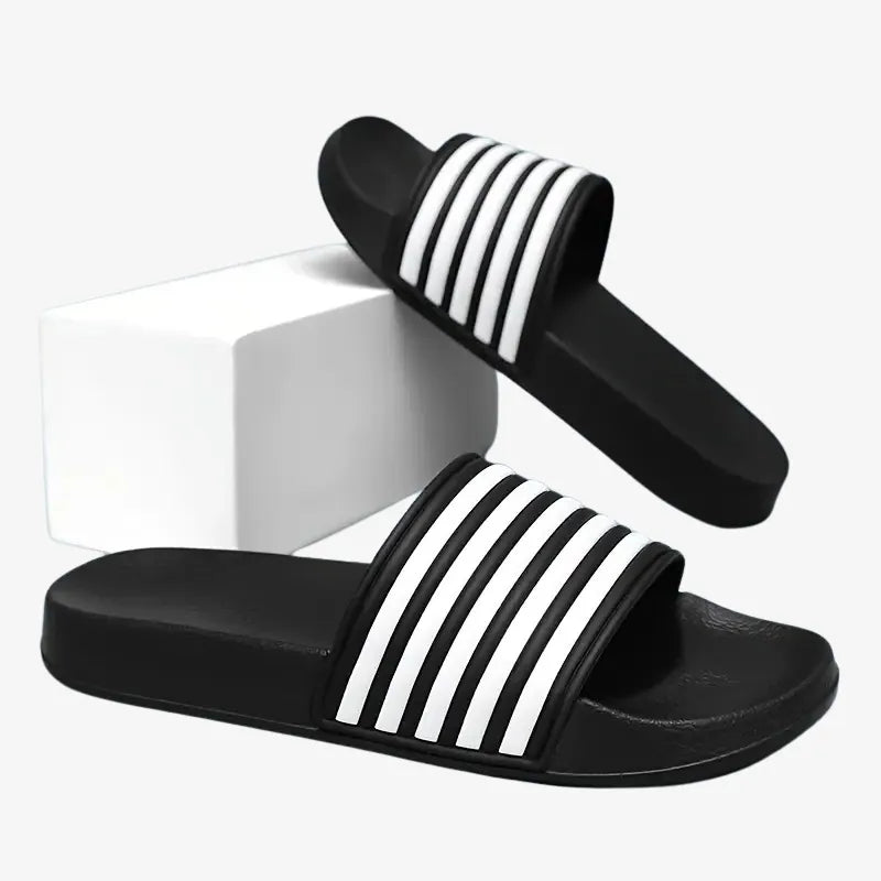 Les Sandales Rayées Confort arborent un design moderne avec des bandes noires et blanches distinctives. Leur style épuré et tendance s'adapte parfaitement à vos tenues décontractées ou sportives.